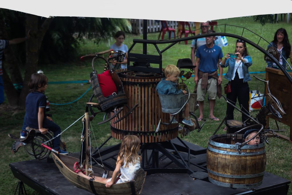 Ce manège unique est une construction artisanale produit en grande partie avec des matériaux recyclés (tonneaux, bouteilles, caisses en bois, disques de freins…). La propulsion s’effectue par les parents en actionnant le bras du pressoir.